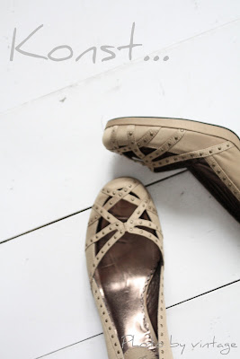 Tisdags temat i fabriken är "vad är konst för dig" ..hm en svår fråga ,konst för mig kan vara ett foto ,tavla ,ett arrangemang av något fint , något i naturen ,frukostbordet =) Ja listan kan göras lång.... Skorna på bilden köpte jag av mammas granne på loppisen dom kan man göra konst av.